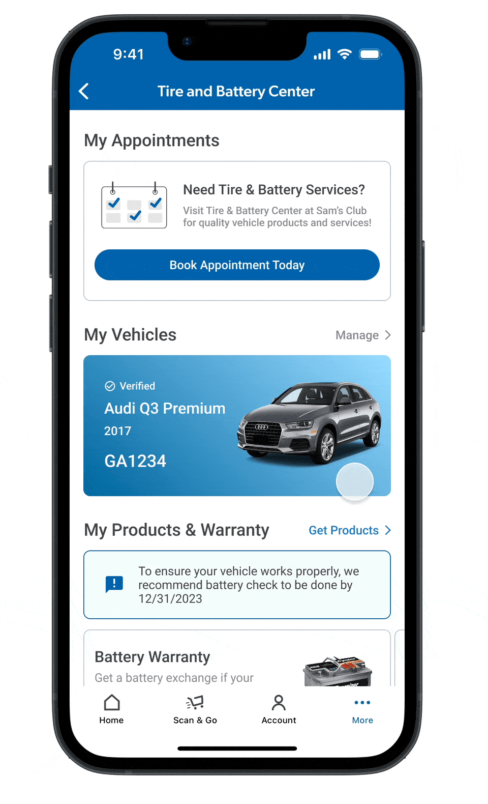 Our proposed design solution would integrate the Tire and Battery Center within Sam’s Club pre-existing mobile app. And members would have the ability to manage their vehicle information, book and checkin for appointments, and receive updates on their service all from the mobile app.